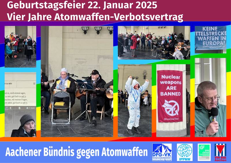 Der Atomwaffenverbotsvertrag der Vereinten Nationen wurde am 22.1.2025 4 Jahre alt. 73 Staaten hatten ihn bis dahin ratifiziert. Er ist ein hoffnungsvoller Gegenentwurf zur Strategie der nuklearen Abschreckung, die uns auf einen wahnwitzigen Irrweg geführt hat. Wir haben im Aachener Bündnis gegen Atomwaffen diesen Tag mit dem gemeinsamen Singen von Friedensliedern gefeiert.